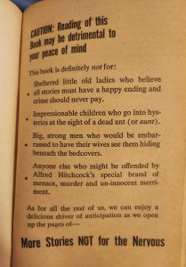 Hitchcock wants every aspect of this book to make you feel uneasy, frightened, thrilled, cautious, and possibly a little amused. This is evident even from the cover art which features a painted illustration of a skull resting on a bookshelf behind Hitchcock’s unperturbed body, as he seems to be reading another collection of his scary stories; to the right of Hitchcock’s body is an elderly person screaming as two hands protruding from the bookshelf behind them are grasping the person’s neck. Hitchcock has some more fun through fake warnings on the first page: “CAUTION: Reading of this Book may be detrimental to your peace of mind.” The structure of many of these stories are perfect examples of what makes a great scary story.