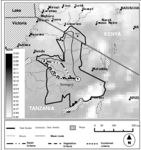 3. GIS Applications (1): Wildlife Migration: Understanding the migration of wildlife is incredibly important, and this research paper focused on how scientists used GIS mapping techniques to track the migration of wildebeest across the Serengeti-Mara habitat. The research included the mean routes of the wildebeest across the landscape and the amount of green space before and after the wildebeest had come through. The results found that the less green space in an area before the wildebeest arrived, the less likely they were to travel through that area because of the lack of water. Source: Musiega, D.E. and Kazadi, S.-N. (2004), Simulating the East African wildebeest migration patterns using GIS and remote sensing. African Journal of Ecology, 42: 355-362. https://doi.org/10.1111/j.1365-2028.2004.00538.x