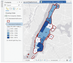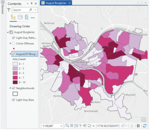 Chapter 4 gets into the databases/ Geodatabases. A very helpful thing to understand when working within ArcGIS- they are the central storage bank for all information/ data that pertains to a certain organization or project. File geodatabases have no limits to the size or amount of feature classes or raster datasets could be stored in it, and it keeps all your project information in one easy to access place! Over the course of the next few chapters, I used the geodatabase for each chapter to select any files I needed, quickly. It’s good to learn how to convert external files into the proper format for the file geodatabase, so you know how to work on a map from an external source. This is primarily because when working on a project from scratch, a lot of the data needed might not be available from the Esri/ ArcGIS collections, and would prompt the need for an outside source (like a census bureau tract for example). There was a bit of bookkeeping this chapter, with moving files around and developing understanding of these databases. One thing I learned that I found very helpful was that if you delete something from the contents pane, it is still filed in the geodatabase and can be brought back to the map. While on the other hand, if something is deleted straight from the database, that is permanent. As someone who is very nervous when deleting anything on a project, understanding how the files work within their environment and where backups are is good knowledge to have! I also liked that the system won’t let you accidentally delete any important keys from the field table. This is very reassuring as working with the tables can get somewhat confusing, and I’m always worried I’ll hit a button and accidentally erase a needed field. It was also interesting to learn that GEOID and GEOIDNumber are technically the same data, but two different ways that the field can be categorized. While they are the same kind of attribute, they cannot be joined together due to their different codes (GEOIDNum- 4048 vs GEOID- 04870). Diving deeper into the Python language and SQL helps me develop a stronger understanding of what I am doing when adjusting the code on my map. Like understanding that using ‘OR’ within a data query is essentially saying and/ adding the two fields instead of using one or the other like it sounds- and using ‘AND’ means the opposite, picking one or the other. Using the SQL and Definition Query to plot out exact pockets of dates and times to find the specific data you’re looking for is especially important when you need a small time pocket of data from a larger scaled data set.
