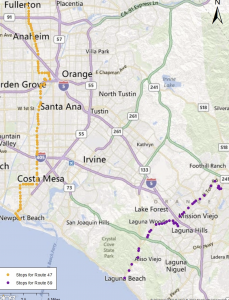 A second application of ArcGIS Online is improving public transportation routes. ArcGIS Online has been used to investigate the walkability of bus routes in order to improve efficiency in transportation in Orange County, California. The map below depicts southbound bus stop locations.
