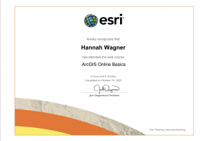 I then completed the ArcGIS Online Basics web course. I enjoyed this course and the information it gave me. I learned about all the different layer types. I also thought it was cool that there are many different sharing options to control who has access to your organization’s content. Two trainings that interest me are ArcGIS Online: Editing Essentials and 3D Visualization Essentials.