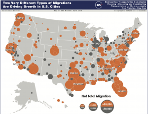 Also, I found a map called “Metro Population Growth and Decline in the United States.” It shows how metro populations across the U.S. are growing or shrinking based on both domestic and international migration.