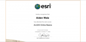 I then did the ArcGIS Online Basics course. This course delved deeper into what ArcGIS online is. It really focused on the collaboration and sharing aspect of ArcGIS online. It then also talked about how these maps are set up; with base maps layers, uploading/downloading data, operational layers, and analyzing tools.