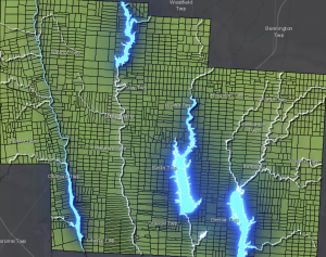 For my first app I decided to use basic ideas for chapter one to create a map that highlights the accessibility to water sources in the Delaware County in relation to the farm lots. I made added effects to make the water ways stand out against the farm layer, and emphasize their location.