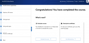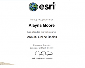 I have completed the course “ ArcGIS Online Basics”. I found this course to be a useful way to prepare students to use an unfamiliar website. For example, they introduced how to navigate web maps and use basic tools within ArcGIS Online. The course also described how we can share maps and build web applications, which was a nice refresher, as I remembered sharing one or two applications in ArcGIS Online in GEOG 291.